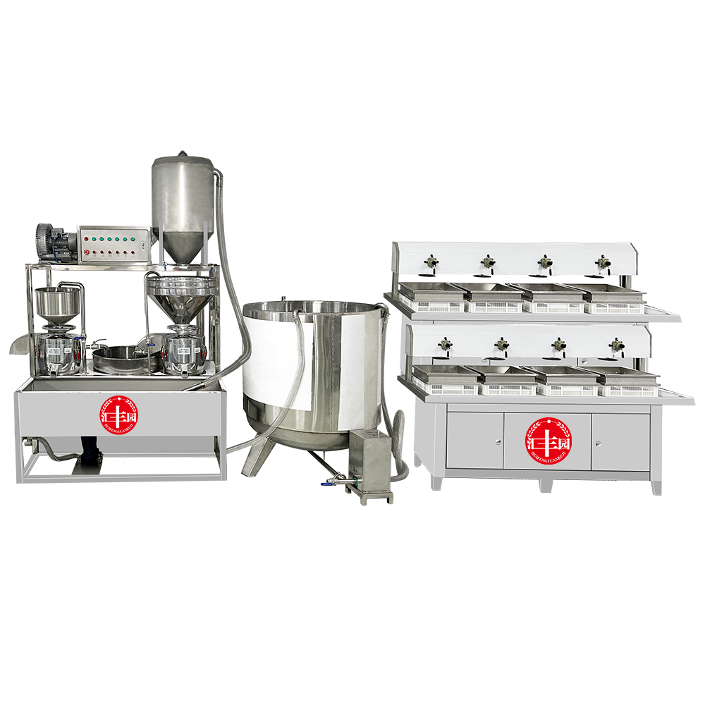 我公司生產(chǎn)豆腐機(jī)在國(guó)內(nèi)是較早的企業(yè),多年來(lái)通過(guò)對(duì)設(shè)備的不斷改進(jìn),利用現(xiàn)代科技與傳統(tǒng)工藝的完美結(jié)合。使設(shè)備外觀設(shè)計(jì)美觀、智能化高,操作簡(jiǎn)單,主要有自動(dòng)上豆系統(tǒng)、磨漿機(jī)系統(tǒng)、拌渣提升系統(tǒng)、煮漿桶(蒸氣機(jī)用戶自備)、成型機(jī)等組成。機(jī)器采用不銹鋼制造,干凈衛(wèi)生,技術(shù)領(lǐng)先,質(zhì)量可靠,經(jīng)久耐用。實(shí)現(xiàn)了批量生產(chǎn)過(guò)程自動(dòng)化,具有高效、省時(shí)、耗能低等優(yōu)點(diǎn)。采用先進(jìn)空真上豆技術(shù)和連續(xù)磨漿技術(shù),瞬間加熱工藝,保證了蛋白質(zhì)不受破壞,從而使生產(chǎn)出來(lái)的豆制品營(yíng)養(yǎng)更豐富,味道更鮮美。工藝流程: 將浸泡好的黃豆由高速分離磨漿機(jī)加工,排出豆渣,產(chǎn)出的豆?jié){經(jīng)過(guò)蒸汽加熱達(dá)到去腥,并煮漿均質(zhì),并添加輔助原料消泡、凝固劑(如鹵水、石膏、內(nèi)脂、酸漿等)、成型和深加工處理便可產(chǎn)生出營(yíng)養(yǎng)豐富的豆制品如:豆?jié){、豆腐腦、豆腐、豆桿、豆皮、素雞、豆泡等制品,適用于大型賓館、超市、企業(yè)食堂、工程店及食品廠批量加工使用。